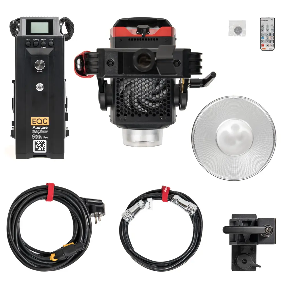 Der LS 600d Pro wird über eine All-in-One-Steuerungsbox mit Strom versorgt, die mit zwei hochlast V-Mount-Akkus oder mit dem mitgelieferten AC-Kabel bei 230V betrieben werden kann. Sie ist auch die erste Lampe, bei der es möglich ist, die Akkus zu laden, während sie an Netzstrom angeschlossen ist.