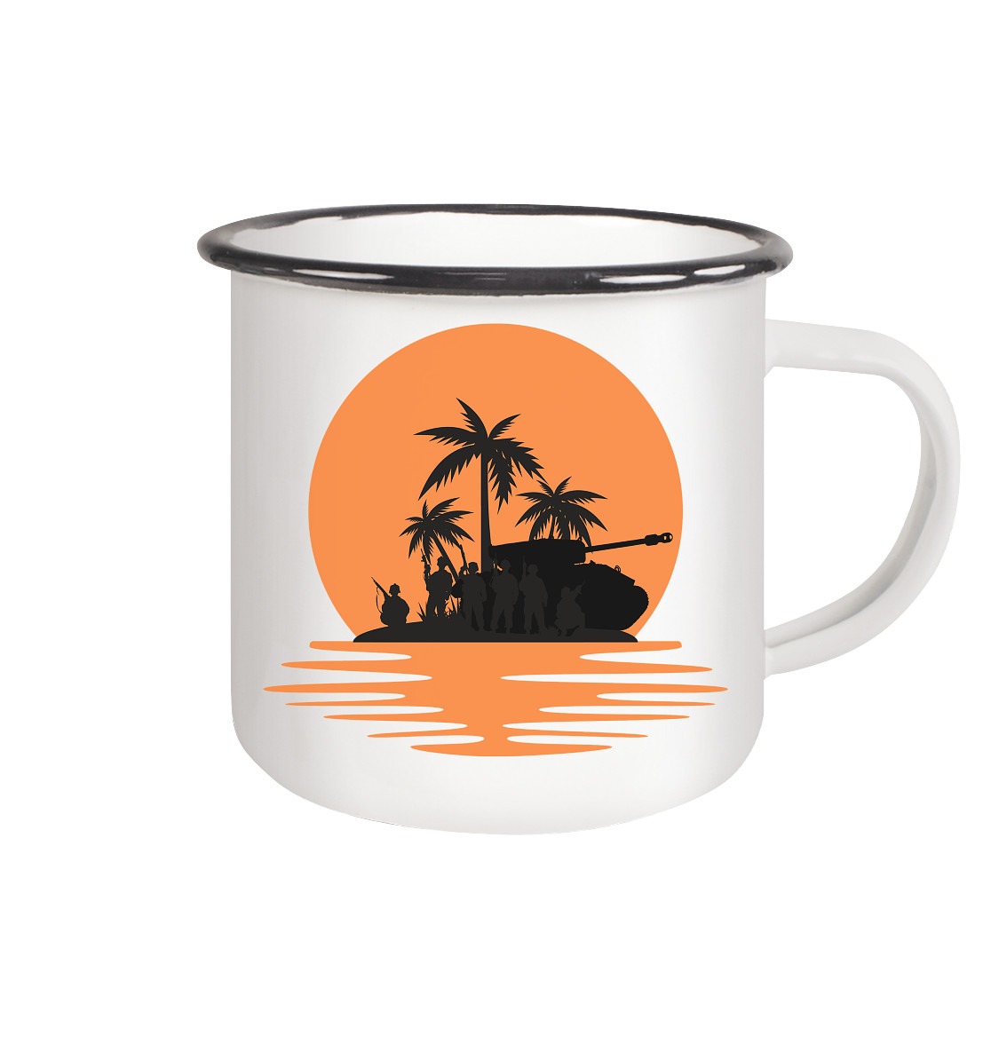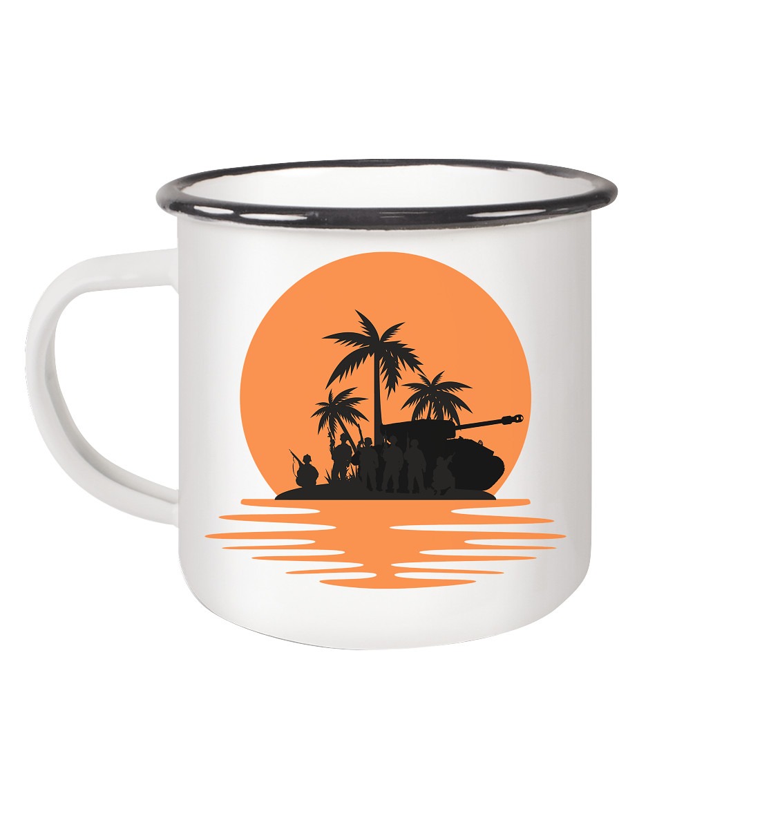Das weiße Design des Bechers zeigt ein atemberaubendes Bild eines Sonnenuntergangs mit Soldaten im Vordergrund, das perfekt zur Stimmung des Bechers passt. Dieser Becher ist ein hervorragender Begleiter für alle, die gerne draußen sind und sich an der Natur erfreuen.