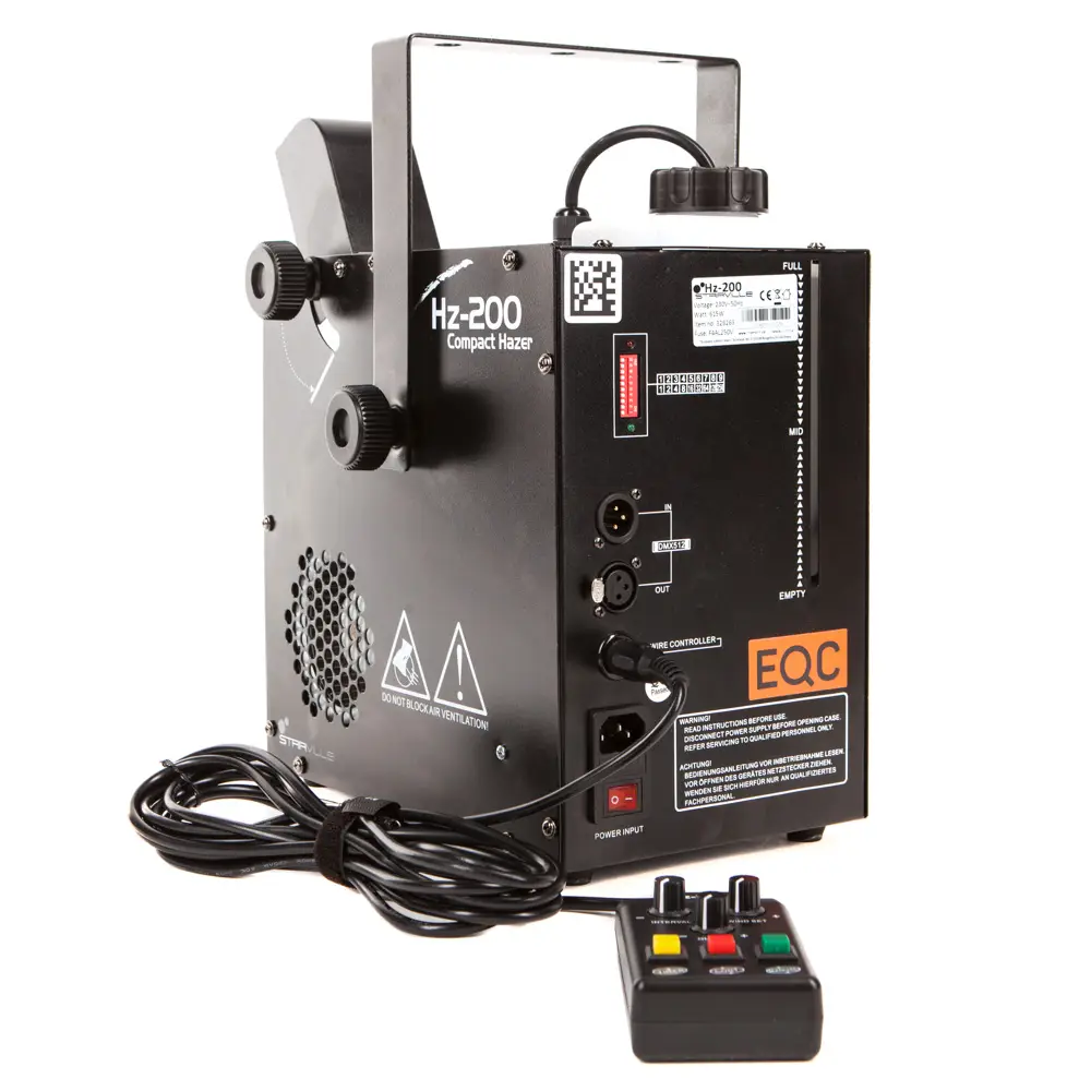 Der Stairville Hz-200 Kompakter Hazer ist ein kleiner und sehr effizienter Hazer. Er kann über DMX-512 oder komfortabel über die mitgelieferte Timer-Fernbedienung gesteuert werden. Die manuelle Einstellung der Leistung ermöglicht eine optimale Verteilung. Ein vollgefüllter Tank bringt dich locker über einen ganzen Tag am Set.