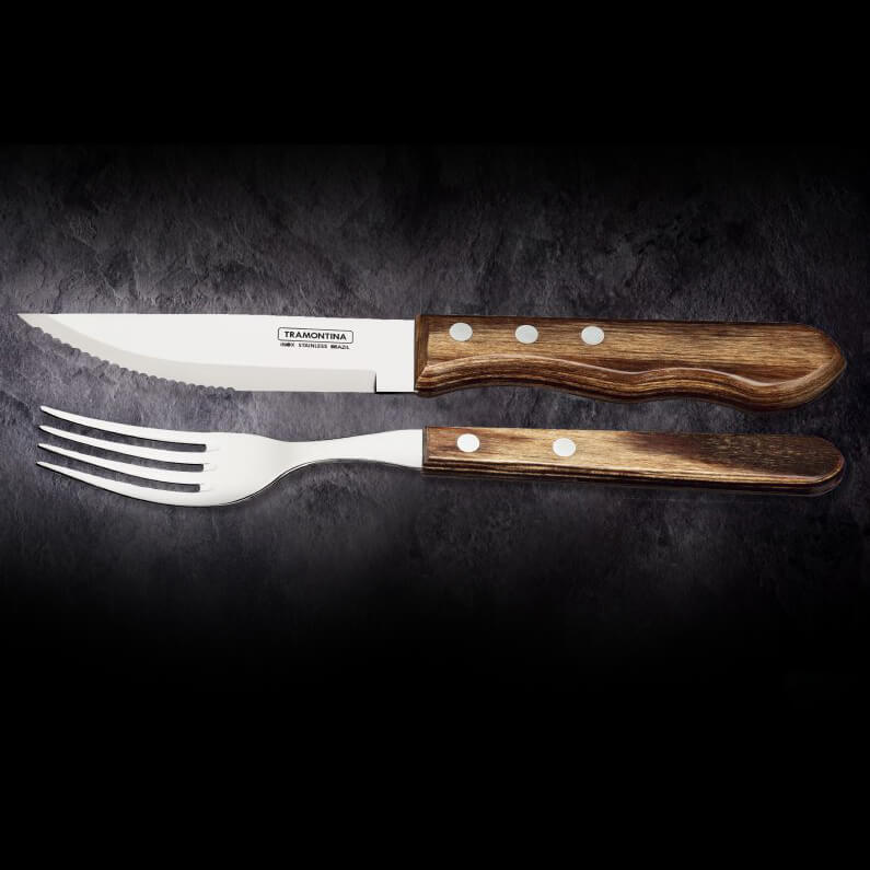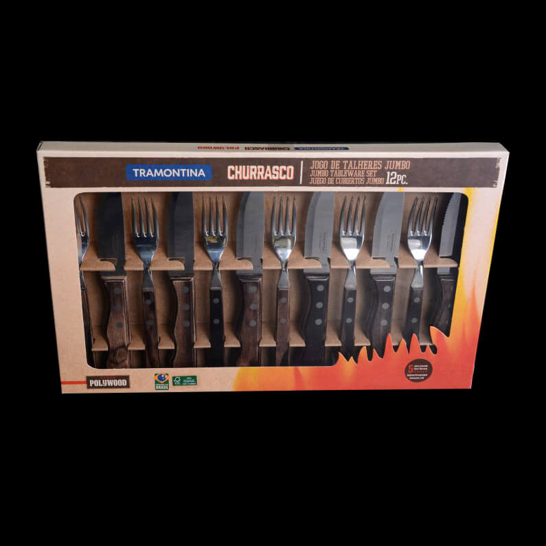 Grillkünstler wissen das traditionelle Churrasco aus Brasilien zu schätzen. Hier wird das frische Fleisch typischerweise mit grobem Salz gewürzt, gegrillt und anschließend in netter Gesellschaft verspeist. Damit das saftige Grillgut auch stilgerecht zerteilt werden kann, bietet TRAMONTINA das 12-teilige Jumbo-Steakbesteck an. Die extrem harte Klinge aus rostfreiem Edelstahl (AISI 420, entspricht DIN 1.4028) begeistert durch eine lange Schnitthaltigkeit. Sowohl die Griffe der Messer als auch der Gabeln sind aus Echtholz gearbeitet. Dieses Holz aus mehreren mit Harz imprägnierten und gepressten Schichten Kiefernholz ist extrem widerstandsfähig, stoßfest, Temperatur unempfindlich und Spülmaschinen geeignet. Auch nach häufigem Gebrauch wirkt das Grillbesteck-Set edel und wie neu.