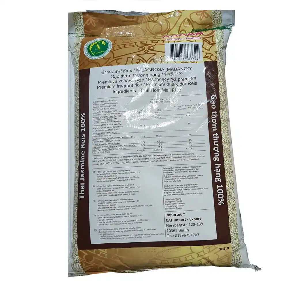 Thai Premium Reis Hom Mali ist ein hochwertiger Duftreis aus Thailand, der für seinen einzigartigen Geschmack und sein unverwechselbares Aroma bekannt ist. Dieser Reis, auch als Jasminreis bekannt, gehört zu den besten Reissorten der Welt und wird in den fruchtbaren Regionen Thailands angebaut.